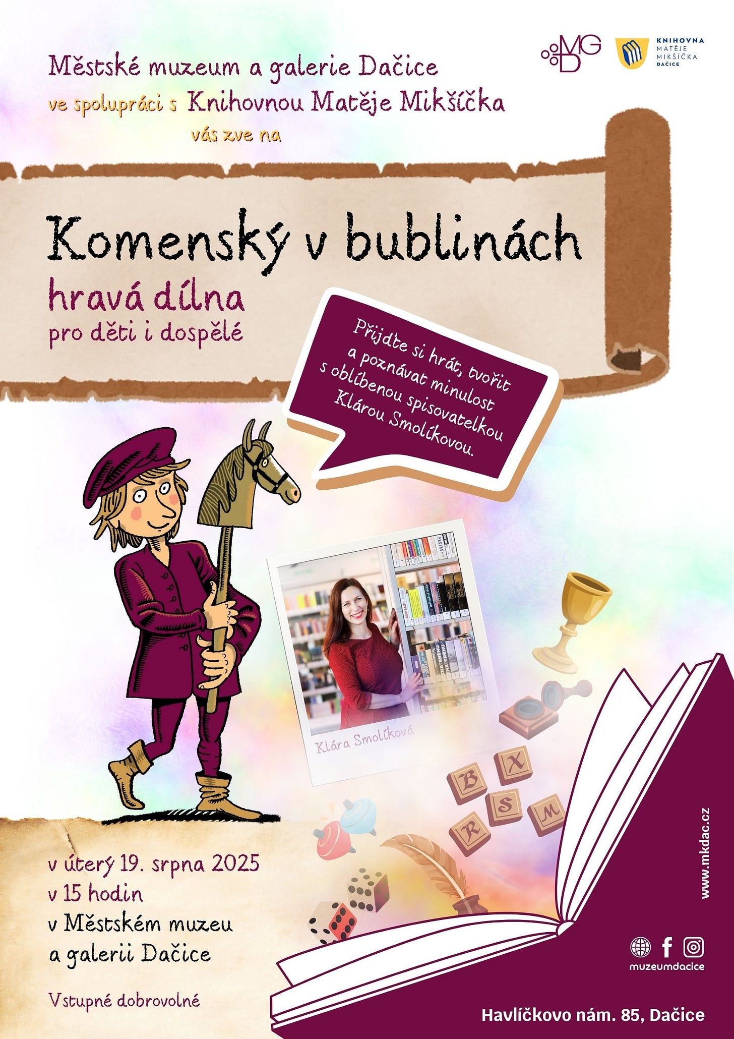 Pokud dorazíte v úterý 19. srpna v 15:00, osobně vás výstavou provedu. Děti si vytvoří vlastní komiks o dramatickém útěku J. A. Komenského do Anglie, vyzkouší si práci s tiskařským strojem, ochutnají život včelaře a zjistí, jestli Komenský opravdu sestrojil perpetuum mobile.